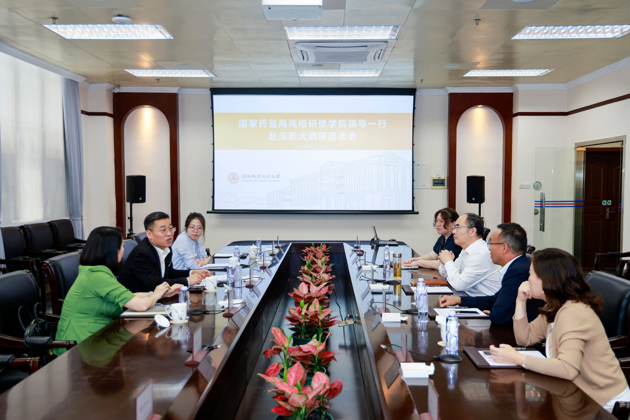 3月25日上午,国家药品监督管理局高级研修学院党委委员、副院长臧克承一行来校考察调研。深圳市市场监督管理局许可审查中心干部吴赟生、黄碧敏随同来访。深圳职业技术大学党委副书记、校长许建领,党委副书记何莉,食品药品学院党委书记、院长刘冬、药学专业主任刘然、药学专业教授孙海燕等参与调研活动。