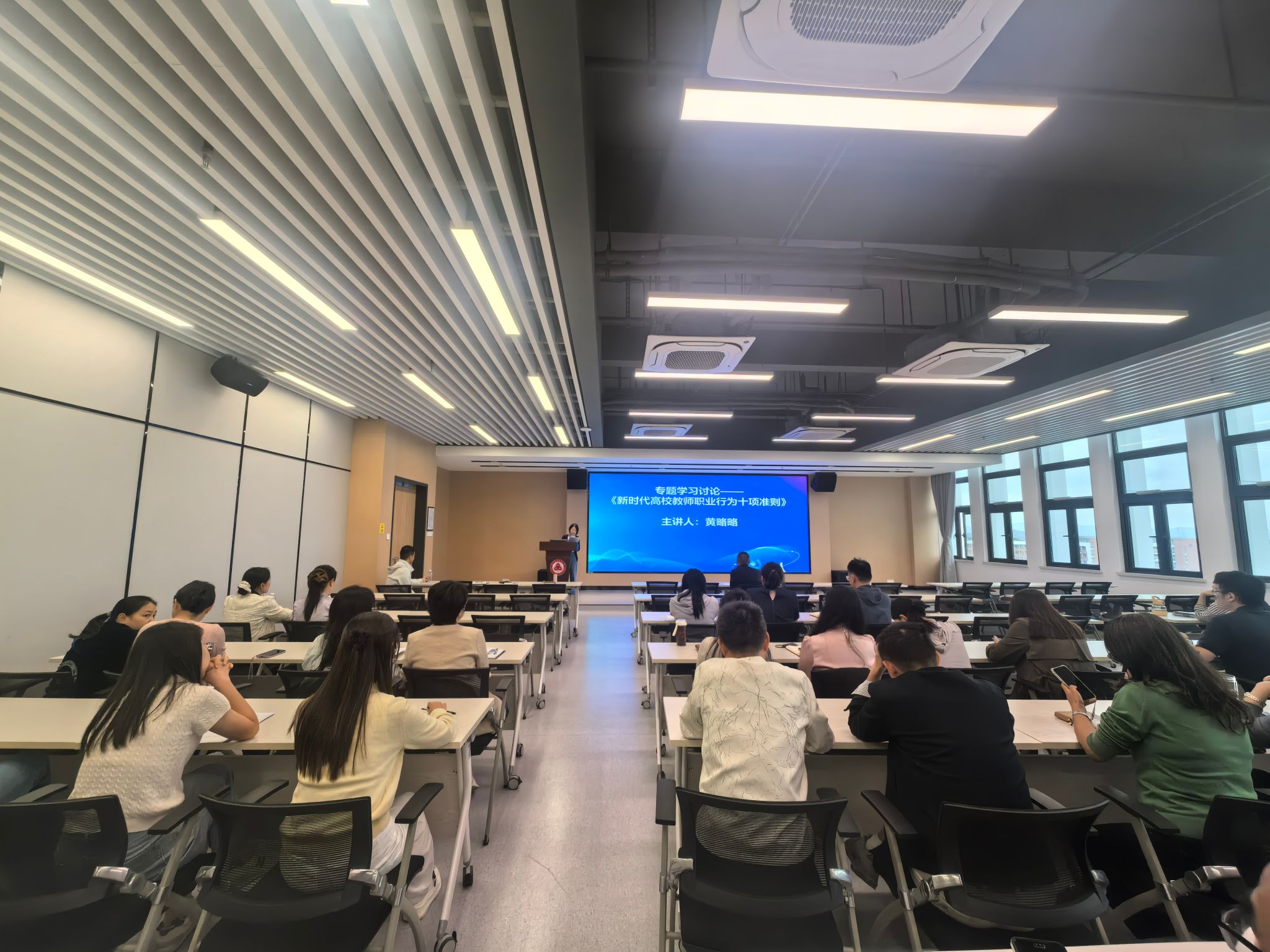 会议伊始,黄略略副院长带领与会教师专题学习了《新时代高校教师职业行为十项准则》。她通过剖析一系列的反面典型案例,将抽象的准则要求具象化为生动的警示教育,让老师们对师德的底线和红线有了更为清醒和深刻的认识。