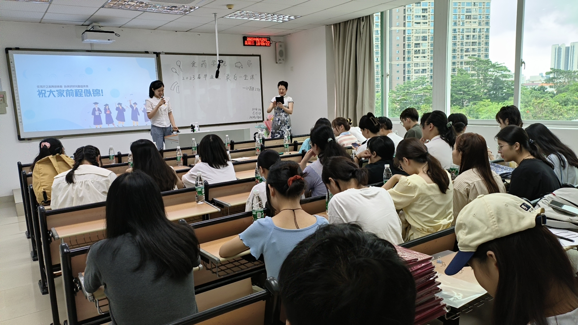 最后,为更好落实2023届毕业生文明离校工作,激发“母校情”,砥砺“报国志”,着力营造“健康、文明、和谐、奋进”的毕业文化氛围。在毕业典礼结束后,食药学院于官龙山校区教学楼召开2023届毕业生离校的最后一课主题班会。在主题班会上,各个毕业班班主任围绕办理离校手续、退宿、党团关系转接、毕业派遣工作等毕业生关心、关注的问题进行讲解。同时积极引导毕业生爱校荣校,文明离校,并倡议毕业生们文明用网,维护学校声誉,落实“今日你以深职为荣,明日深职以你为荣”, 为校园生活画上圆满的句号。