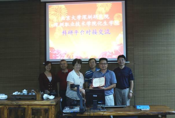 9月24日下午,北京大学深圳研究院院长、深港产学研基地主任史守旭,深圳环境材料研发与检测公共服务平台主任居学成、北京大学香港科技大学深圳研修院博士后工作站部长井凯霞等一行8人来我校化生学院交流,双方在留仙洞校区知行园B座茶艺室召开科研平台对接交流会,化生学院院长张俊松、副院长林峰热情接待了来访一行,深圳市高分子材料改性与加工公共技术服务平台主任肖望东在交流会上受聘为北京大学深圳研究院兼职研究员,校际科研平台深度合作拉开序幕。